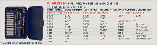 Wright Tool 6 Point Standard & Deep Blow Mold Socket Set 1/4" Drive SAE 223-MC