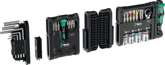 At Mr. Tools, we carry sets in both metric and imperial sizes. Consider where you live and what type of nuts and bolts you’ll be working with. In the United States, the imperial system is more often used, while in other parts of the world, the metric system is preferred. All of the Wera sets come with their “Take it Easy” color-coded system, which allows you to easily find the correct socket you need for the job. Some of our sets come with bits that transform the ratchet and allow it to be used as a screwdriver. Sets come in a variety of sizes, from a pocket set to a 43-piece set. They include features such as a freely pivoting ratchet head, a comfortable plastic sleeve handle, and 5-in-1 ratchet capability. The sets come in either a textile box or a metal case, or smaller sizes have a clip to secure to your toolbelt.