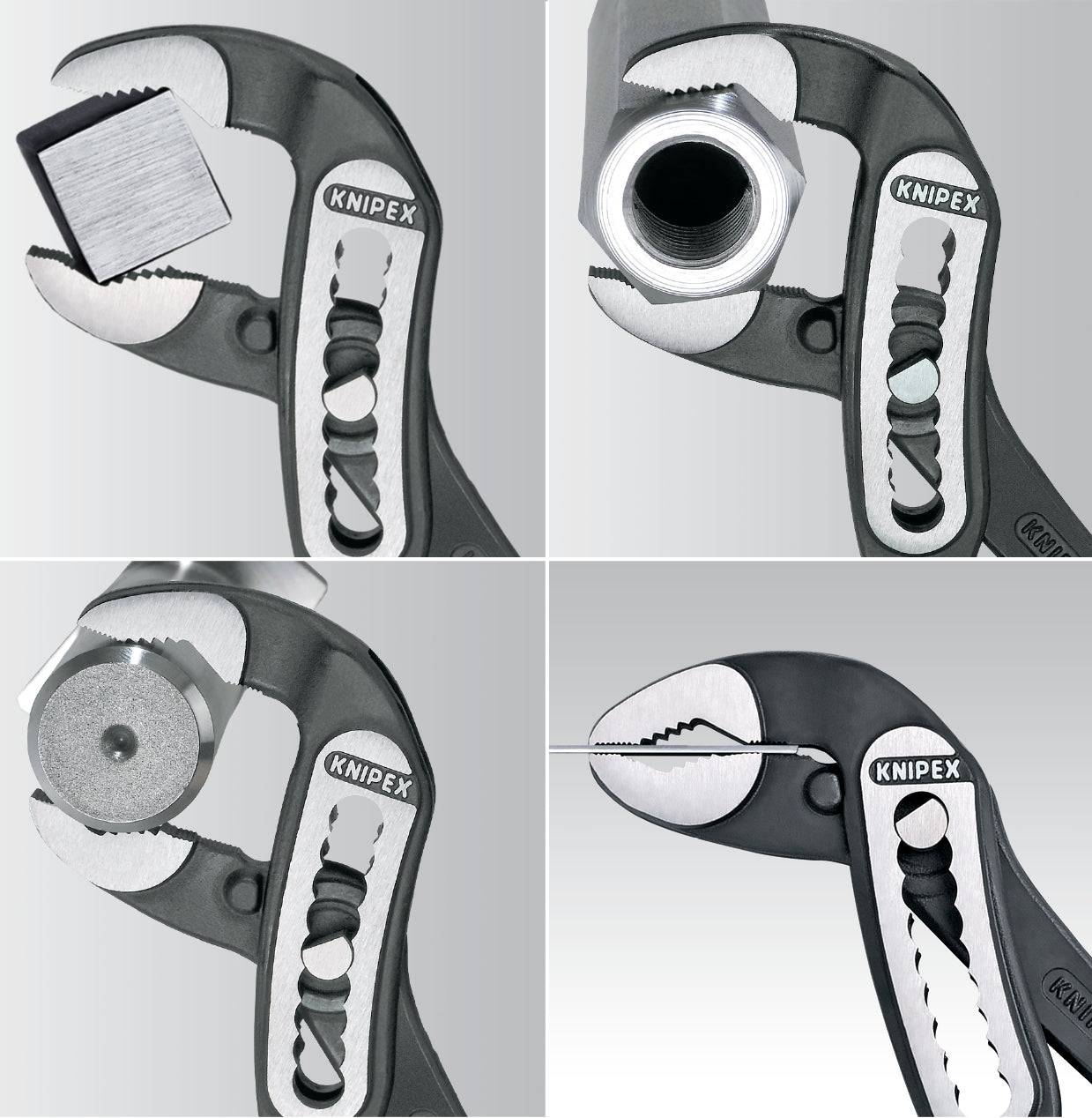 Providing more output and comfort compared to conventional water pump pliers of the same length, the KNIPEX Alligator Water Pump Pliers offers 9 adjustment positions for 30 percent more gripping capacity. More output and comfort compared to conventional water pump pliers of the same length. Offers 9 adjustment positions for 30% more gripping capacity. Good access to the workpiece due to slim size in the head and joint area. Self-locking on pipes and nuts means no slipping off the workpiece and low hand force required. Gripping surfaces with special hardened teeth, teeth hardness (approx. 61 HRC): low wear and reliable gripping. Box-joint design: high stability because of double guide. Robust construction, suitable for outdoor work. Pinch guard prevents operators' fingers being pinched. With slim, two-color multi-component sleeves for better handling and easier transport. Chrome vanadium electric steel; forged, multi stage oil-hardened.