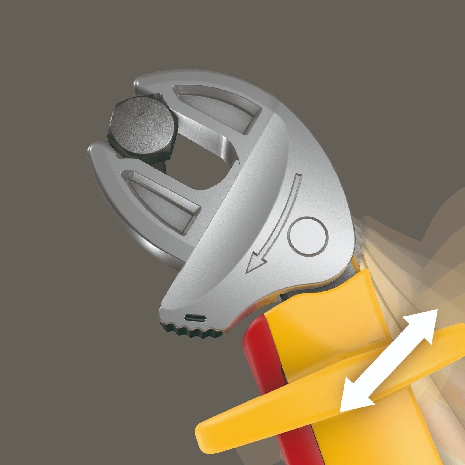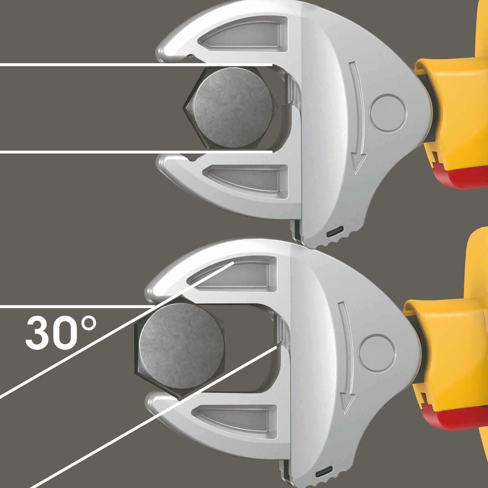 Individually tested tools as per IEC 60900 at 10,000 V for safe working at the approved voltage of 1,000 V. The adjustable VDE spanner continuously and automatically grips all hexagonal sizes in the indicated range of dimensions - metric and imperial. The integrated lever mechanism securely clamps the hexagon screw or bolt between the jaws, which significantly reduces the risk of slippage or damage. The ratchet feature ensures fast and consistent screwdriving without removing the tool. By using the corner-width rectangular prisms, a back-pivoting angle of only 30° can be achieved. The single-arm design, in conjunction with the ratchet feature and the corner-width prism, makes it possible to work even in confined spaces. The adjustable Joker 6004 VDE has a naturally comfortable handle thanks to the 2-component plastic insulation. Safety is increased by the anti-slip protection at the front end of the handle. The sliding function offers contactless and safe opening of the non-insulated jaws, thereby providing extra protection.