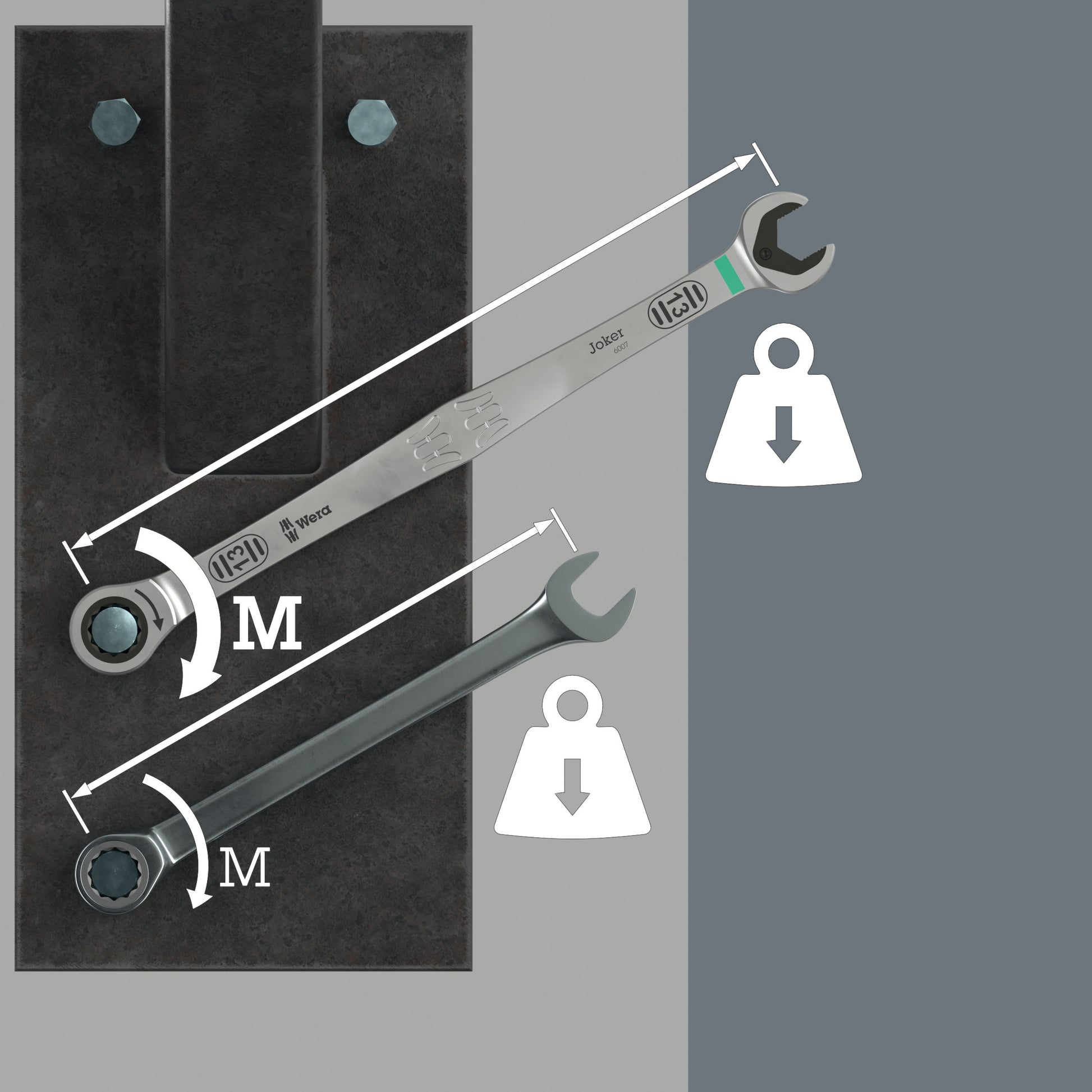 5-piece ring ratchet spanner set. Unique combination of jaw and ring ratchet mechanism in a long design. For hexagon screw heads and bolts. The long lever allows for higher power transmission. The long design also improves accessibility at low-lying couplings. With holding function enabled by a metal plate in the mouth, which reduces the risk of losing screws and sockets. With its extra hard teeth, the exchangeable metal plate in the mouth secures screws and sockets and reduces the risk of slipping. The integrated end stop can prevent the screw head from slipping down and allows application of high torques. The double hexagon geometry ensures a positive connection with the screw or bolt and thus reduces the risk of slipping. A return angle of only 30° at the jaw end avoids time-consuming rotating of the tool whilst screwdriving. Ratchet mechanism at the ring side with exceptionally high fine toothing of 80 teeth for flexibility even in confined spaces. The specially engineered geometry allows high torque transmission and high bending stiffness. Made of high performance chromium molybdenum steel with nickel-chromium coating for high corrosion protection. With Take it easy tool finder: color coding by size and extra laser-engraved size indication. In a robust roll pouch for easy transport and clean storage.