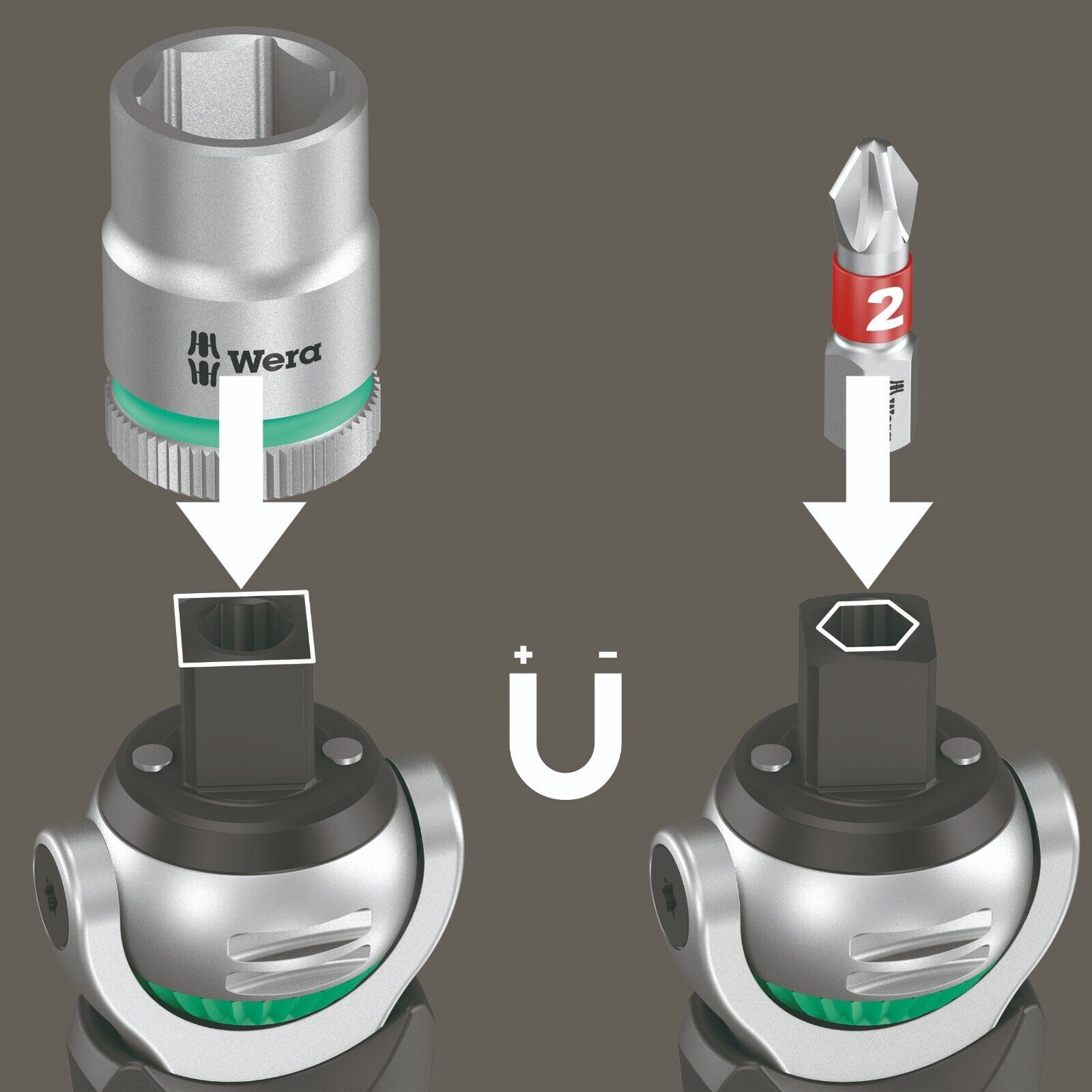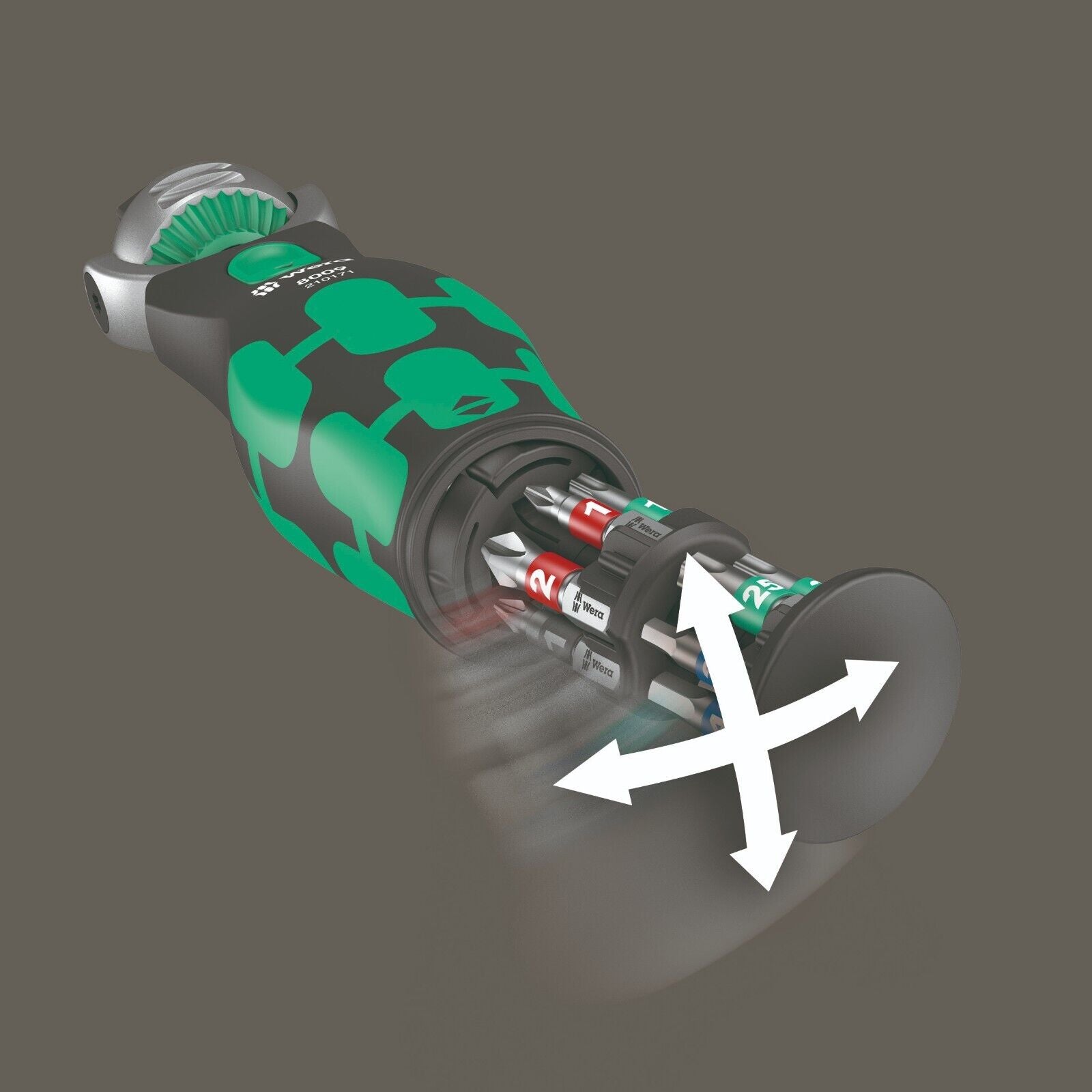 Compact Zyklop ratchet with bit magazine for the pocket. Magnetic direct mounting for ¼" bits and 3/8" sockets. Rapid tool change thanks to the non-locking mounting. As the head is lockable at 0°, 15° and 90°, the tool can be used as a ratchet and as a ratchet screwdriver. The fine toothing with 72 teeth allows for a low return angle of 5°. Wide range of applications thanks to 12 bits integrated in the handle. The robust ratchet mechanism allows for ample torque. Perfect combination of a Zyklop ratchet with a 12-piece screwdriver set.