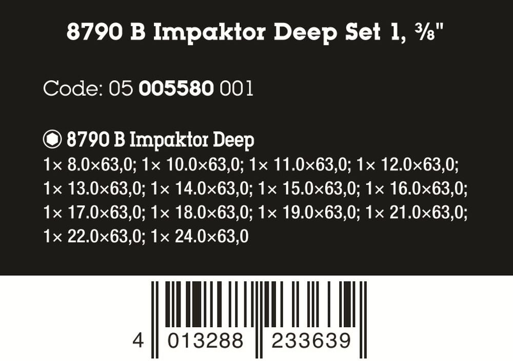 Set with 14 Impaktor Deep socket wrenches for use with electric or pneumatic wrenches with 3/8" drive. Long design for low-lying couplings and protruding thread rods. The Impaktor technology ensures higher-than-average service life even at extreme requirements. The hexagon profile used allows high power transmission while simultaneously being precise and protecting the profile. With Take it easy tool finder with color coding by size - for quick and easy identification of the required tool.