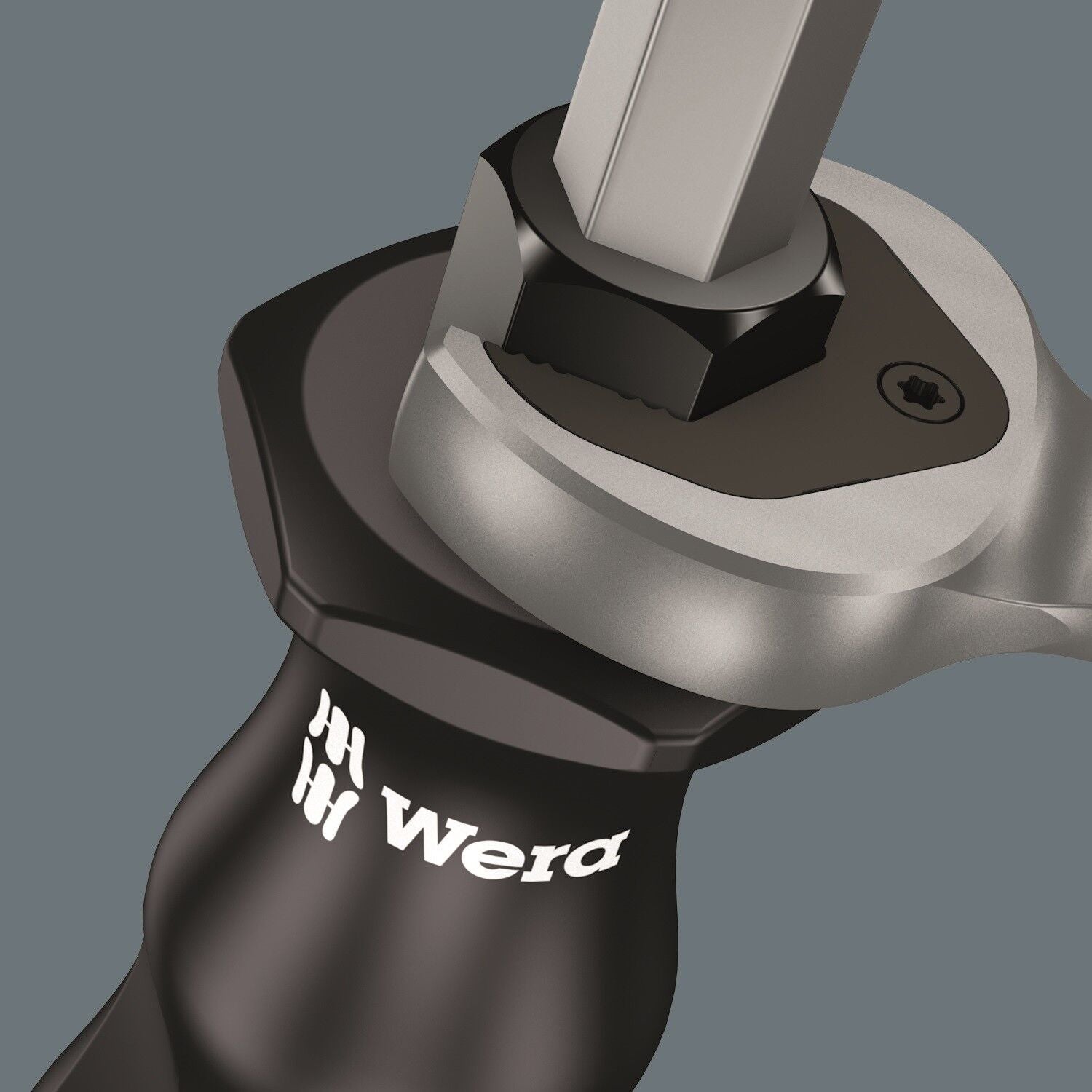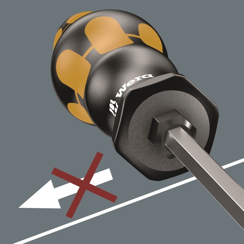 Wera Chiseldriver for fastening, chiseling and loosening seized screws. Multi-component Kraftform handle for fast and low-fatigue working. Kraftform Plus: hard gripping zones for high working speeds whereas soft zones ensure high torque transfer. A hexagon blade out of high quality bit material that extends right through the blade ensures full transfer of force, even when struck with a hammer. The ductile tempered material prevents the blade from splintering or breaking. Comes with an impact cap for enhanced service life and reduced risk of splintering. More torque can be transferred with the help of an open-end or ring spanner applied to the integrated hexagonal bolster. The Wera Black Point tip and a complex hardening process ensure a long service life of the tip, enhanced corrosion protection and an exact fit. The hexagonal anti-roll feature prevents any bothersome rolling away at the workplace