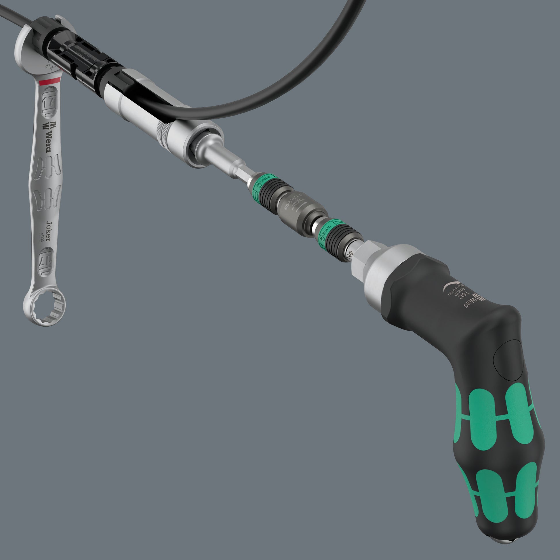7-piece tool set for installing photovoltaic systems. One adjustable torque screwdriver (pistol handle) 7442 for the measuring range 3.0-6.0 Nm. Digital torque value display. Reliable slip-over mechanism and audible signal when the set torque is reached. One 889/4/1 F Rapidaptor bitholding screwdriver with fast-rotating function for a particularly quick return movement without having to remove the tool during clockwise torque operation. One 6003 Joker ring spanner. The special open end geometry expands the placement possibilities of the tool which makes the ring spanner particularly suitable for narrow spaces. 2 installation tools for MC4 solar connectors (MultiContact). One socket 1/2" (with side wire cutout) size 17 for installing panel connectors, one tool shaft (adapter 1/4" to 1/2") for manually operated socket wrench inserts.