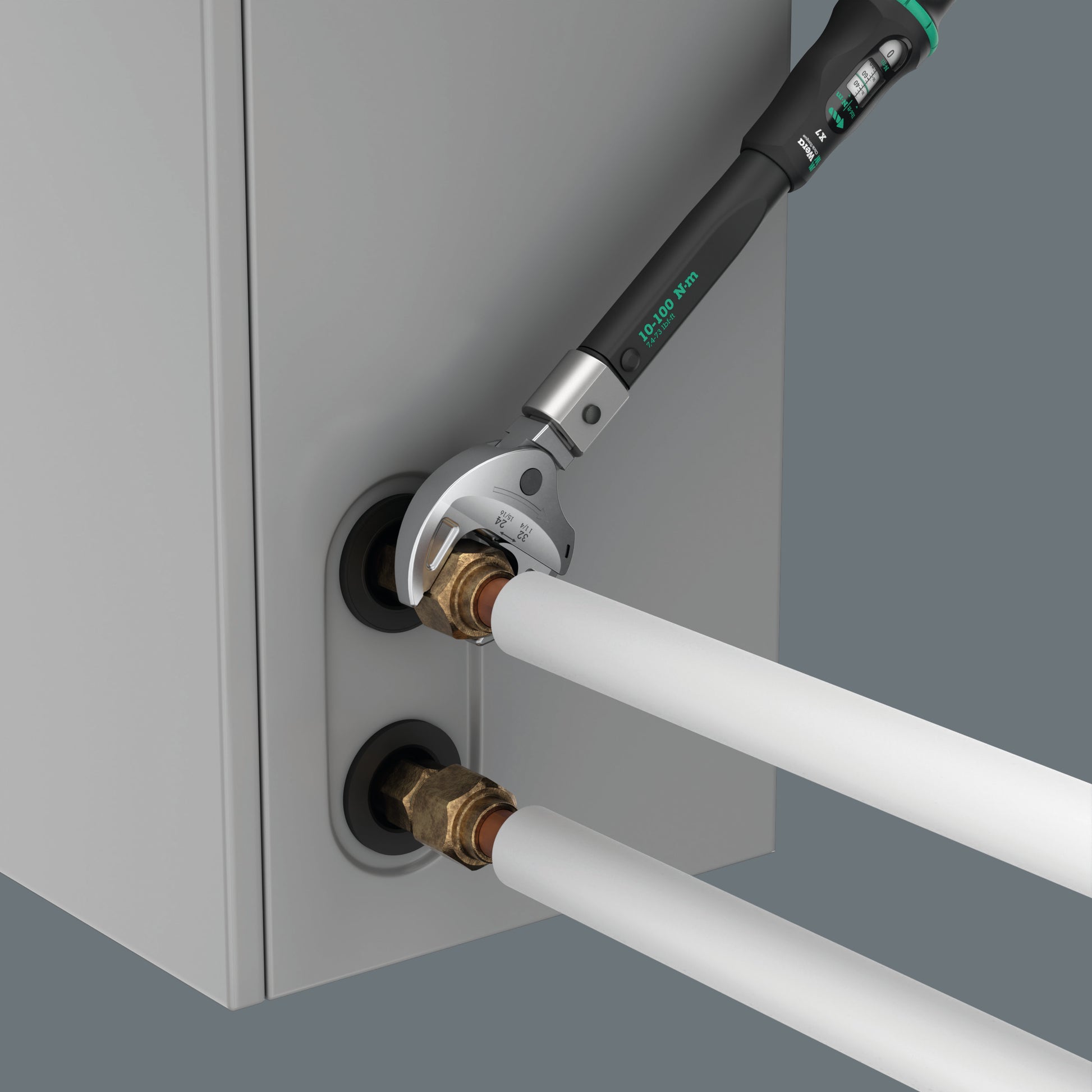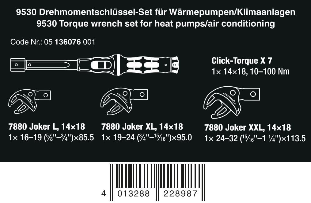 4-piece Click-Torque torque wrench set with three self-setting exchangeable Joker insert spanners. For the proper tightening of screw connections when installing and repairing refrigeration and air conditioning systems as well as heat pumps. Click torque wrench in the distinctive Wera design. Very robust design with high accuracy as per DIN EN ISO 6789-1:2017-07. Easy setting and saving of the default value. The audible and tactile clicks on reaching the scale values facilitate the safe setting of the desired torque value. The robust release mechanism guarantees a clearly audible and tactile release signal when the set torque value is reached. For clockwise and anticlockwise torque-control and with 14x18 mm square head insert for mounting corresponding insert tools. With its continuous and parallel jaws, the three self-setting Joker 7880 insert spanners replace several single spanner sizes. The required size is automatically and continuously set when attaching the tool to the hexagon bolt or screw. The ratchet feature ensures fast and consistent screwdriving without removing the tool. By using the corner-width rectangular prisms, a return angle of only 30° can be achieved.