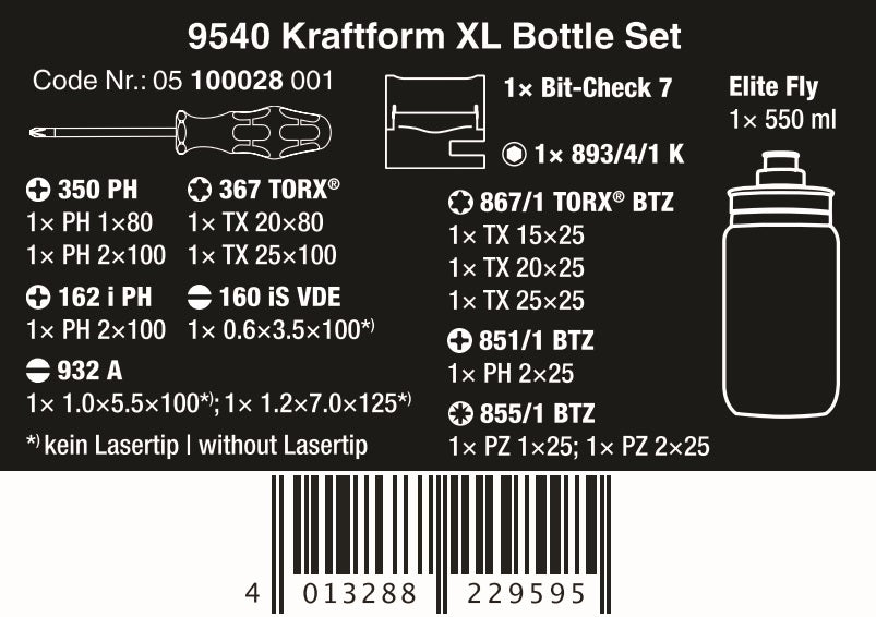 17-piece screwdriving tool set with refillable Elite Fly drinking bottle. Allrounder-Set for the popular profiles Phillips, Pozidriv, slotted and TORX®. Includes different tools: Chiseldriver for screwdriving, chiseling and mortising. VDE screwdriver for working at voltages as well as workshop screwdriver. BiTorsion bits and bit adapter for mechanical screwdriving. With high-quality and super-light Elite drinking bottle in Wera design. Perfect for outdoor activities, suitable for all standard bicycle water bottle quivers.