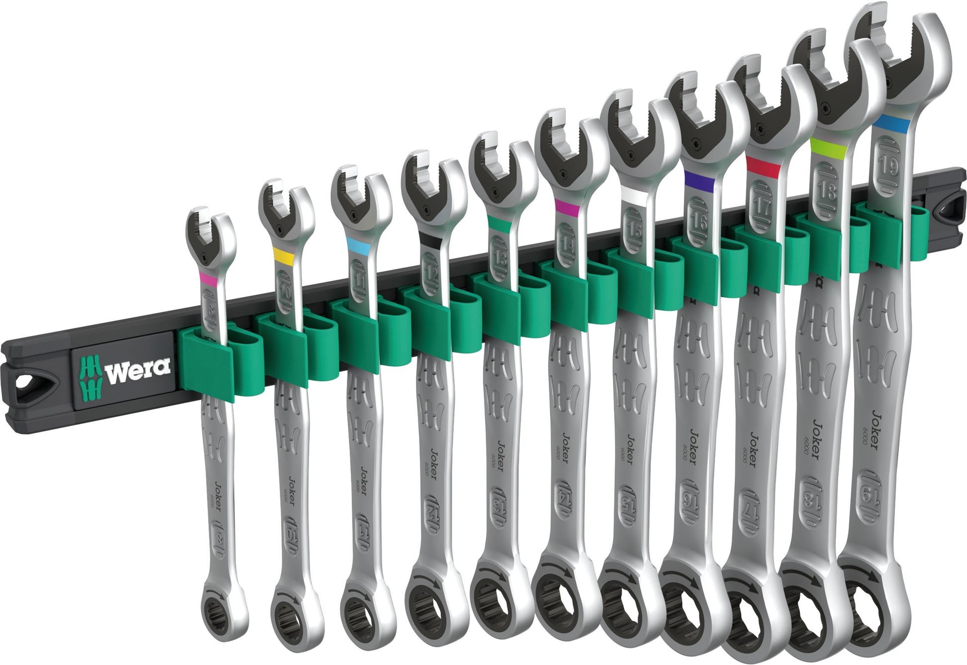 The Joker 6000 ring ratchet spanner with holding function for hexagon screw heads and bolts. With its extra hard teeth, the exchangeable metal plate in the open end secures screws and sockets. The integrated end stop can prevent the screw head from slipping down and allows application of high torques. The double hexagon geometry ensures a positive connection with the screw or bolt and thus reduces the risk of slipping. A return angle of only 30° at the open end avoids time-consuming rotating of the wrench whilst screwdriving. Ratchet mechanism at the ring side with exceptionally high fine toothing of 80 teeth for flexibility even in confined spaces. The specially engineered geometry allows high torque transmission and high bending stiffness. Made of high-performance chromium molybdenum steel with nickel-chromium coating for high corrosion protection. With "Take it easy" Tool finder: Color coding by size. The clips hold the tools perfectly. With its strong magnet, the rail holds securely to metal surfaces. It can also be bolted to the wall.