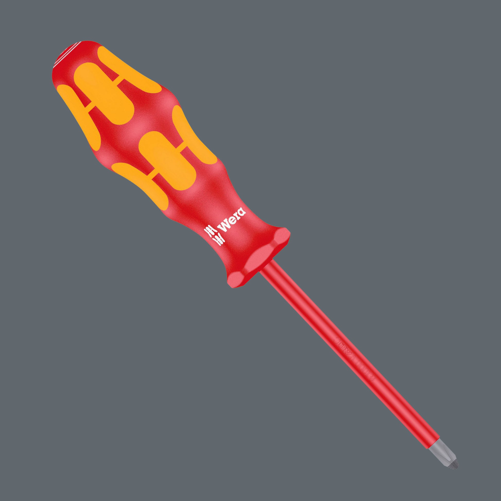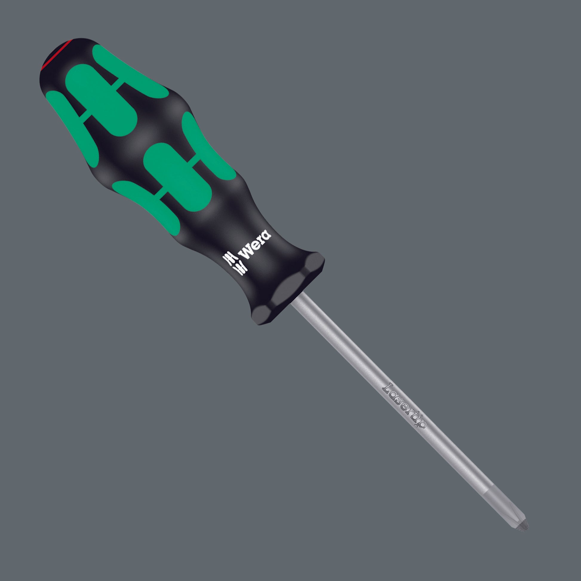 Kraftform screwdriver set, 9-piece set, on a magnetic rail. Screwdriver all-round set. Kraftform Plus handle for comfortable ergonomic screwdriving, avoiding blisters and calluses. Hard handle zones for high working speeds, while soft handle zones guarantee a high torque transfer. 932 A with pound-thru hexagonal blade and impact cap; 350, 355 and 335 with Lasertip: The tips of Wera Lasertip screwdrivers are microscopically roughened with laser beams. This rough surface "bites" into the screw head and unintentional slipping is a thing of the past. 160 iS VDE-insulated and with Lasertip. "Take it easy" Tool finder with color coding by profile and size stamping - for quick and easy identification of the required tool. The clips hold the tools perfectly. With its strong magnet, the rail holds securely to metal surfaces. It can also be bolted to the wall.