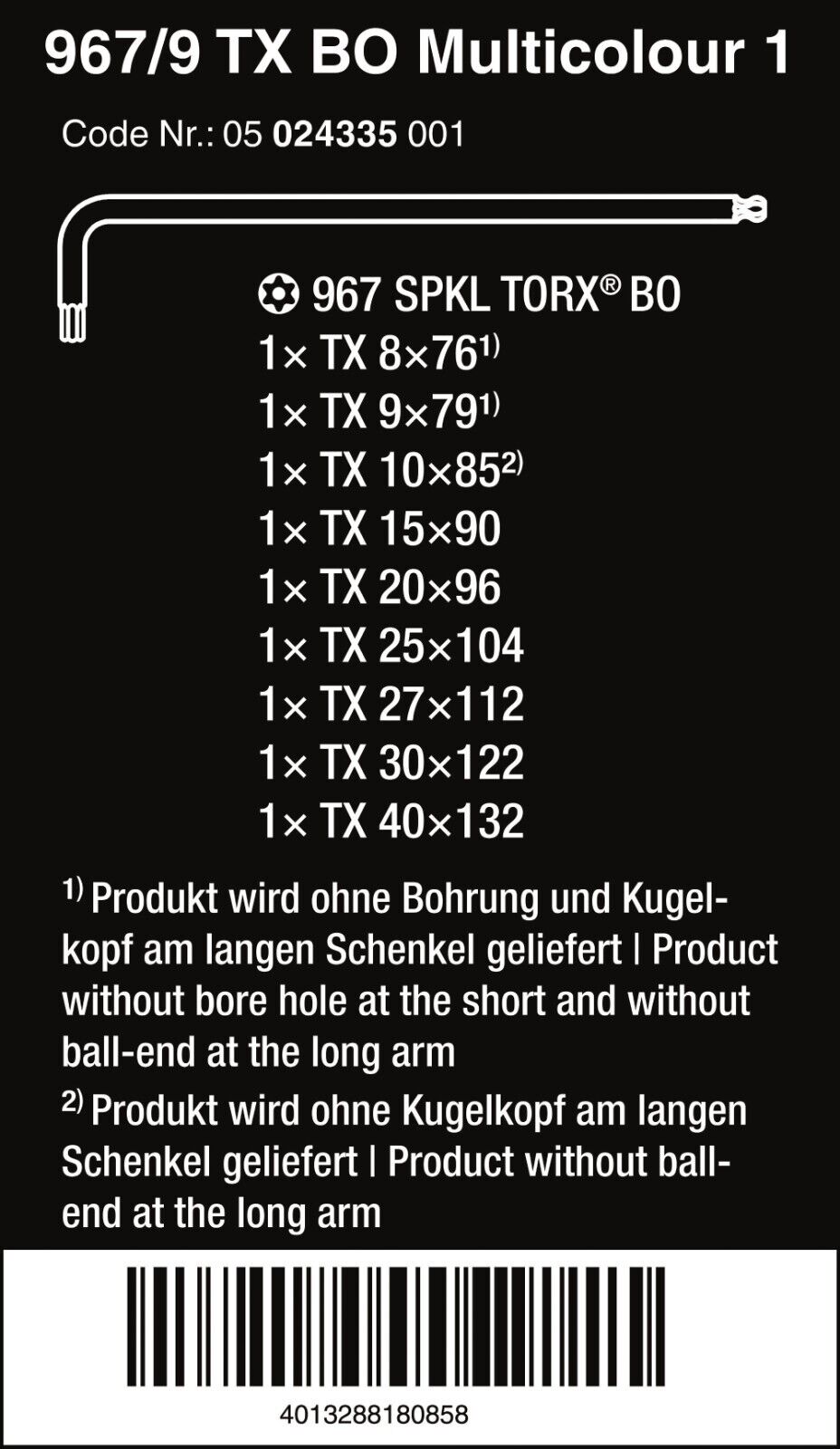 Wera 967/9 TX BO Multicolor 1 Tamper Proof TORX® L-Key Set 9 Pieces 05024335001