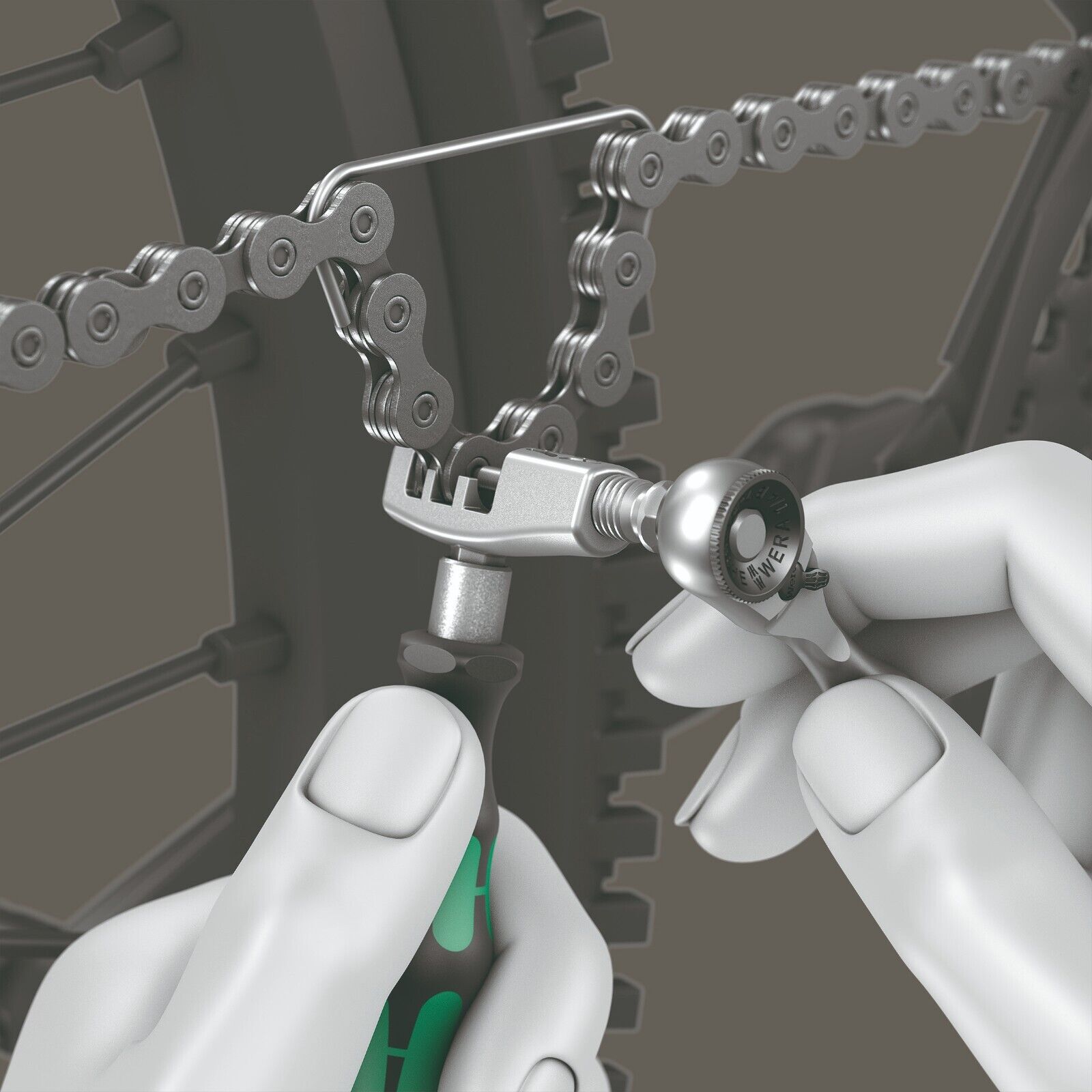 - With chain riveter and chain fastener with exchangeable rivet pin for opening and closing bicycle chains. Suitable for