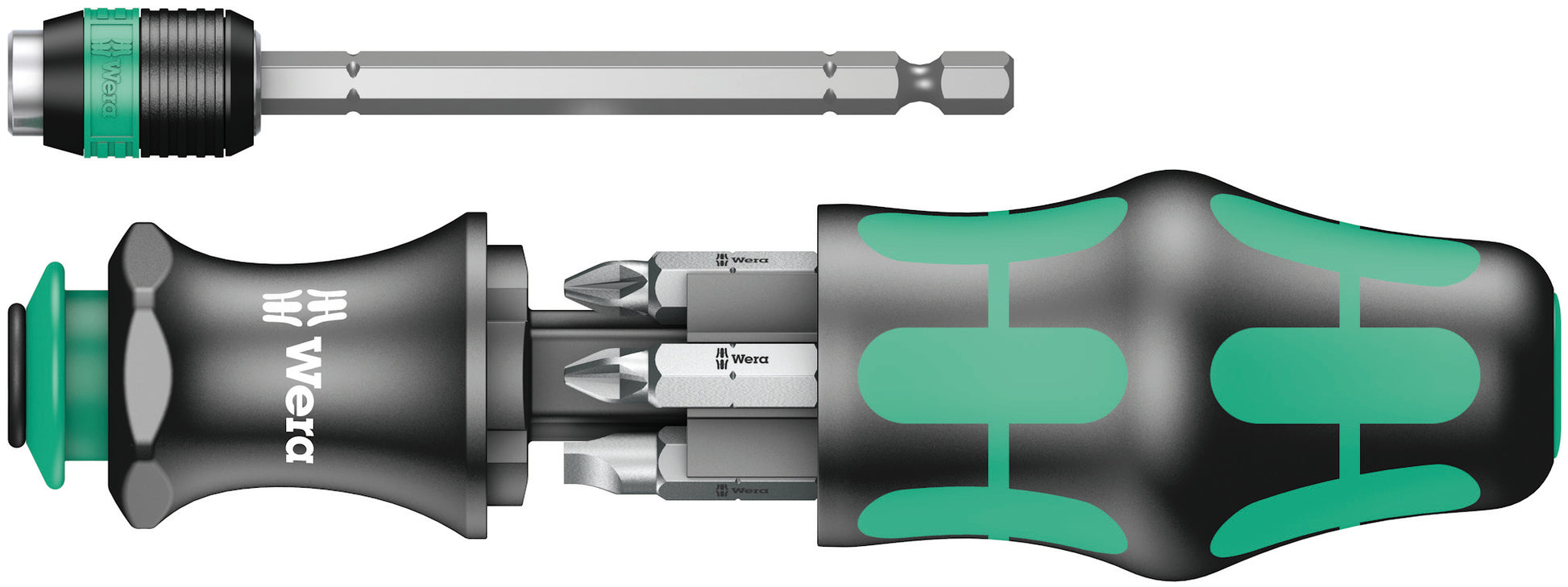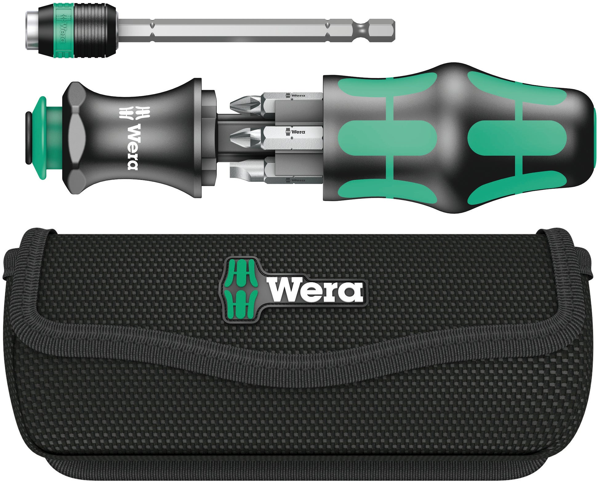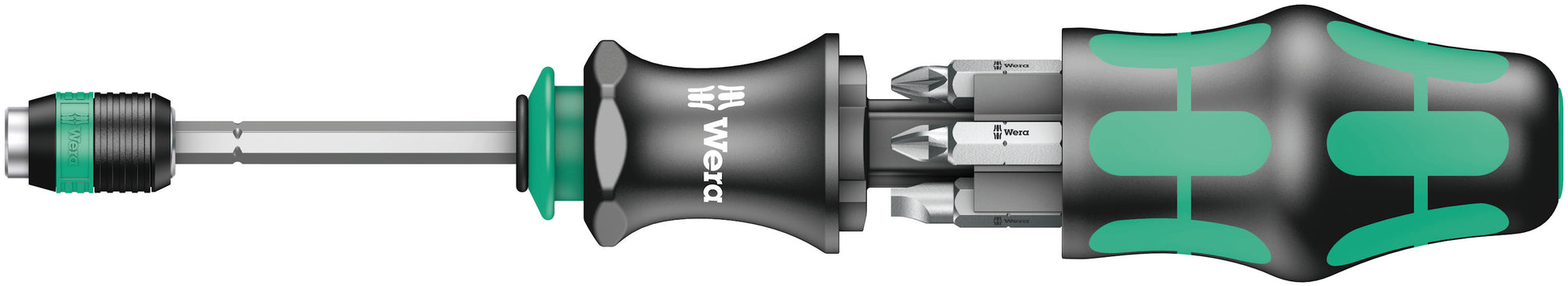 Wera compact tools enable both manual as well as power tool operations at the same time. The handle/interchangeable blade system in a compact design with various blade tips in the smallest of spaces makes the user more mobile and flexible. Suitable for bits with ¼" hexagon head drive as per DIN ISO 1173-C 6.3 and E 6.3 (ISO 1173) and Wera connecting series 1 and 4. Comes with an adaptor, bayonet and Rapidaptor technology. Kraftform handle with anti-roll feature, multi-component for particularly ergonomic screwdriving. Integrated magazine for bit storage. In this way, the set replaces a 6-piece screwdriver set and reduces the equipment required to a minimum. The telescopic bayonet blade - which can be lowered into the handle - together with the quick-release chuck allows fast manual work even in confined installation situations when the blade is retracted. The blade can be extended by simply actuating the locking sleeve. The bayonet holder can then be used as a fully-fledged screwdriver. The bayonet blade can be removed and used as a power tool adaptor, but can also be retracted once again to its original position. Includes practical belt pouch.