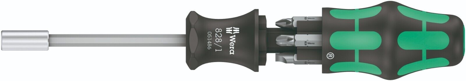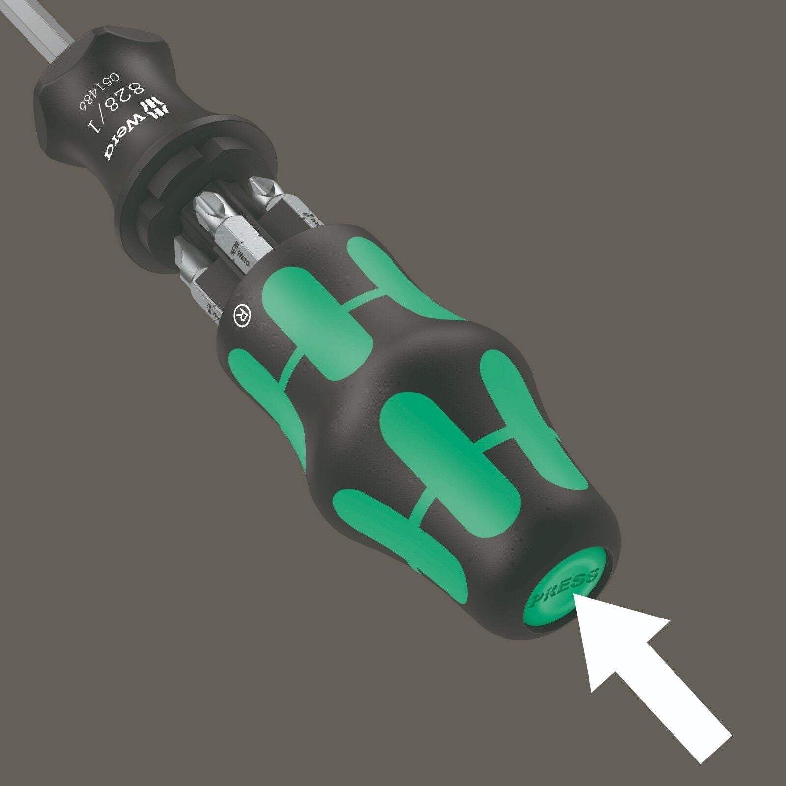 Wera compact tool with multi-component Kraftform handle for high working speeds and particularly ergonomic screwdriving. Bit magazine integrated in the handle, 6 tough bits for universal use. Bit holder with strong permanent magnet for secure seating of the bit.