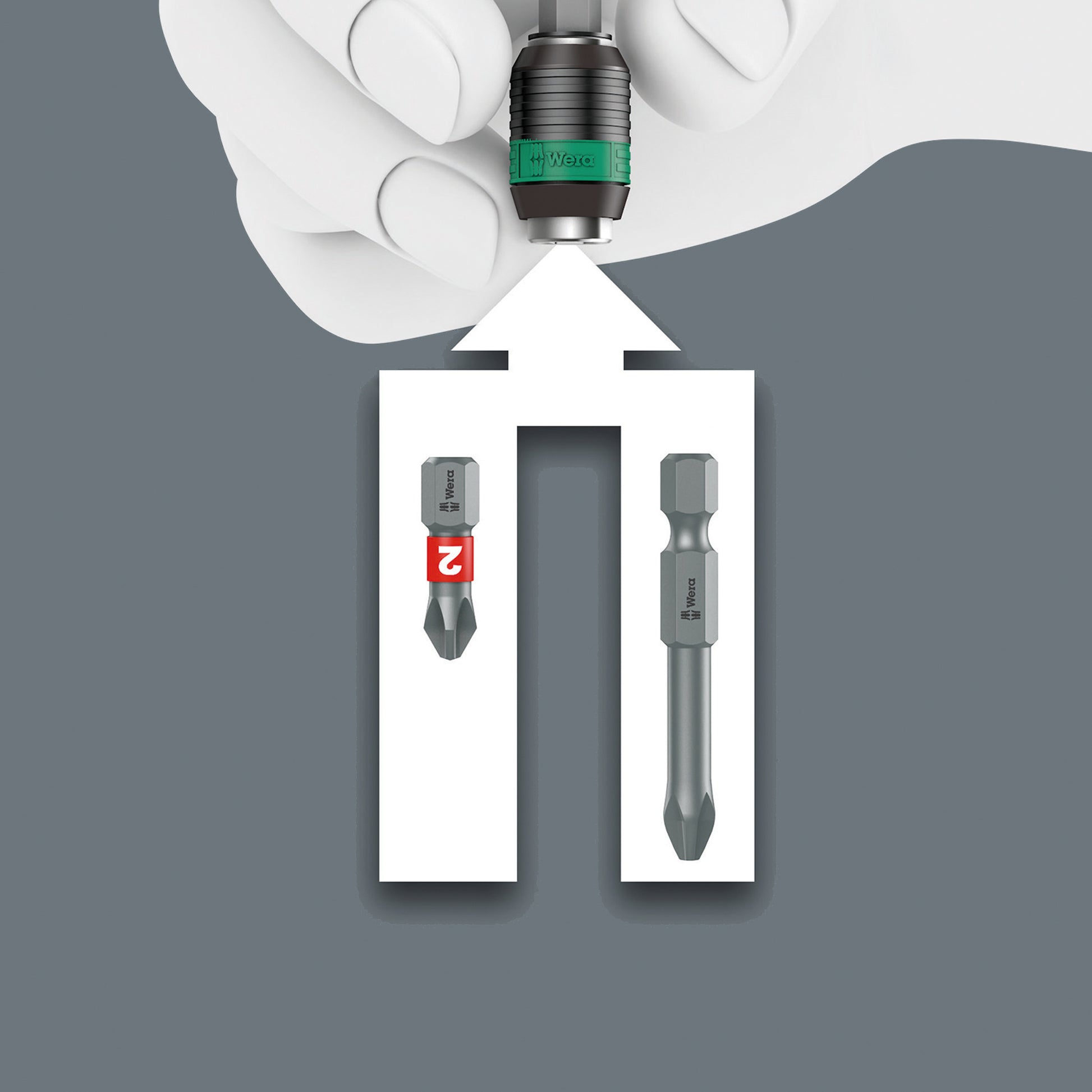 - Rapidaptor bitholding screwdriver with fast-rotating sleeve for lightning-fast bit changes and high working speeds