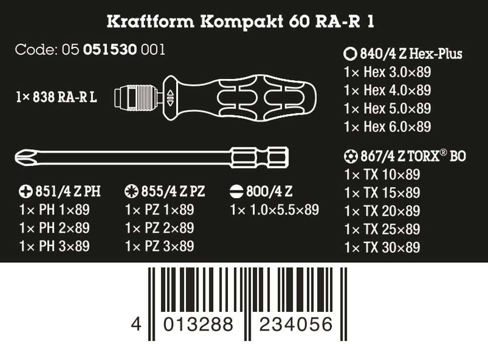 Wera Kraftform Kompakt 60 RA-R 1 Ratcheting Screwdriver Set Metric 05051530001