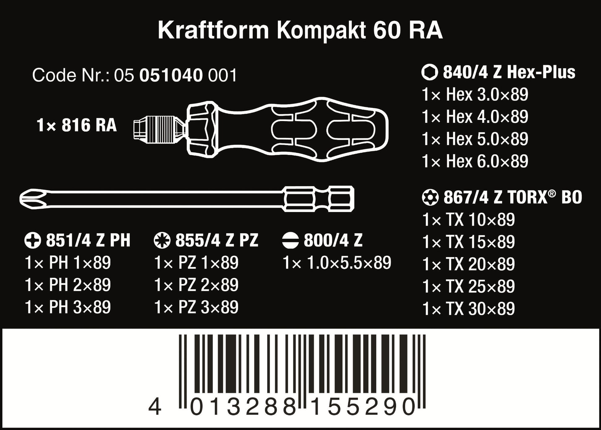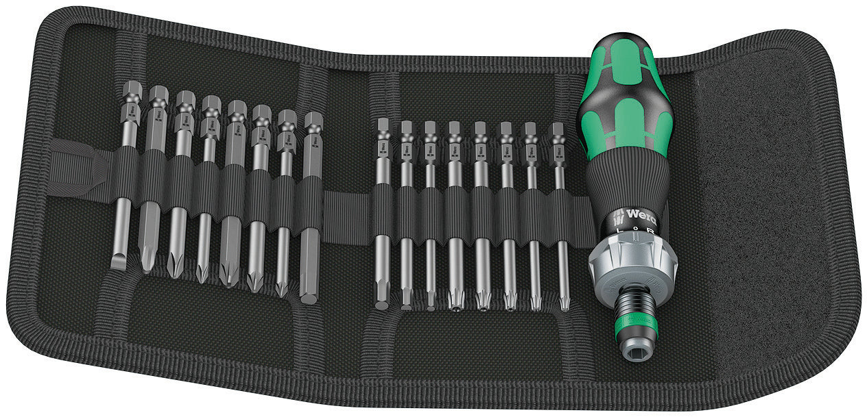17-piece set with bits in a length of 89 mm in a practical pouch. 1 holder 816 RA Kraftform with ratchet functionality: fine-toothing for a small return angle, switchover ring (right, fixed, left), maximum torque of up to 50 Newton meters. ¼" hexagon socket head take-up and Rapidaptor technology for low-fatigue working and rapid bit change; magnetic.